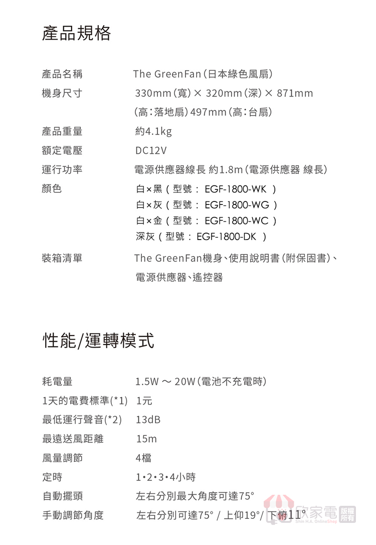 一日電費標準:1 元 ( 風量最低檔,1天8小時運轉為標準。1度電 3.7元計算 )