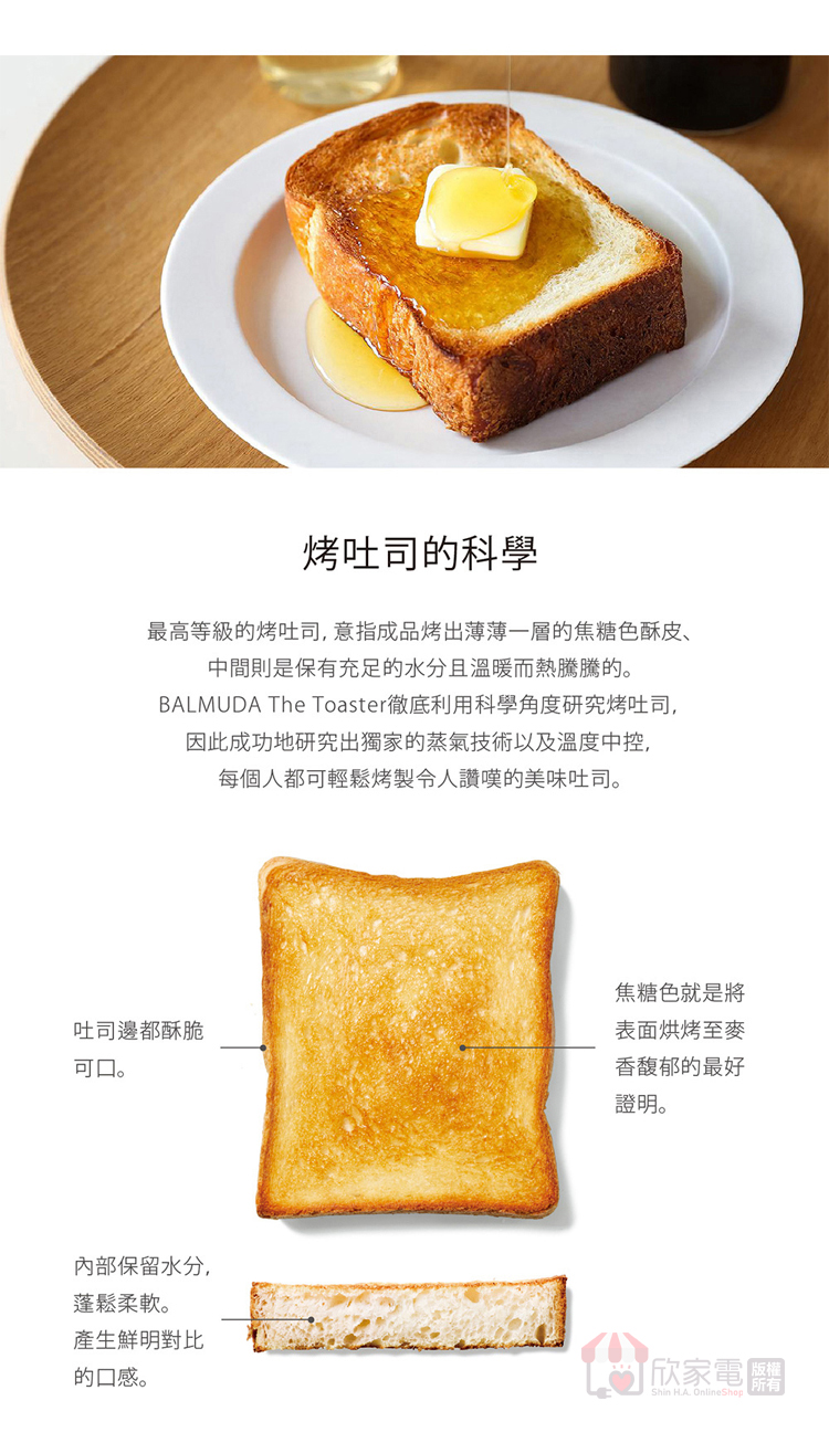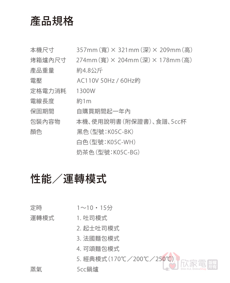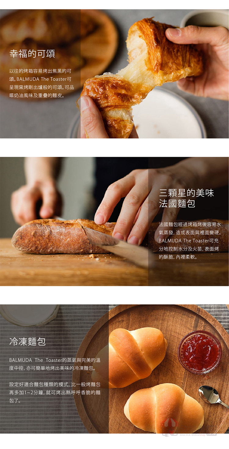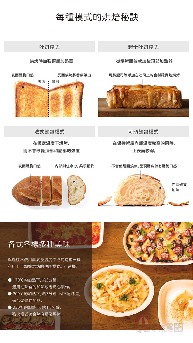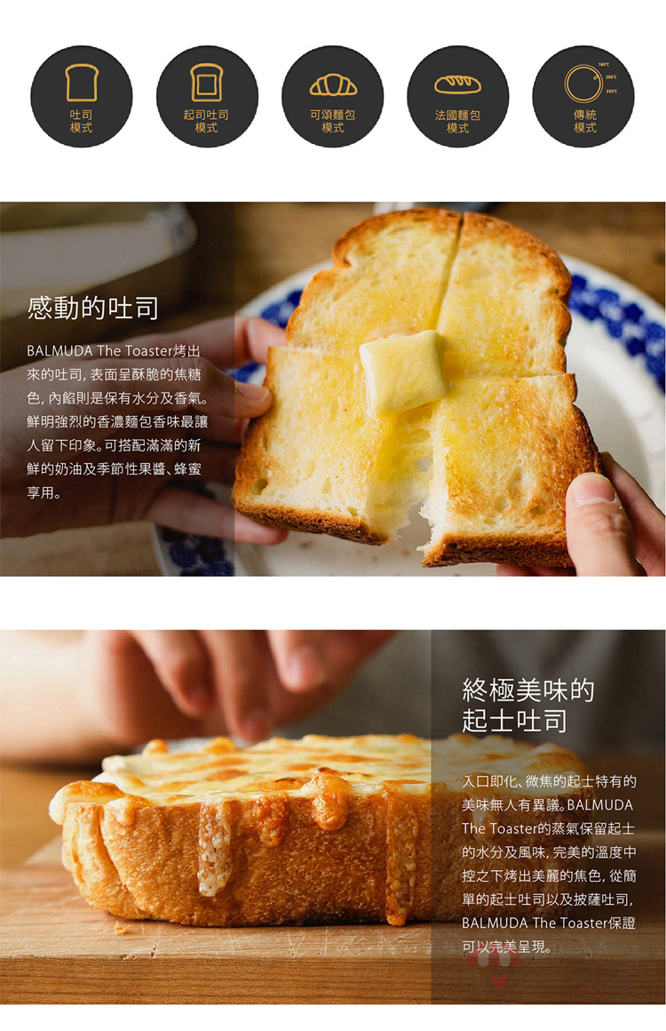 功能模式:1. 吐司模式 2. 起士吐司模式 3. 法國麵包模式 4. 可頌麵包模式 5. 經典模式(170℃/200℃/250℃)