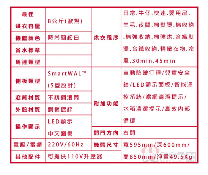 附加功能:自動防皺行程/兒童安全鎖/LED顯示面板/智能溫控系統/濾網清潔提示/水箱清潔提示/高效內部循環