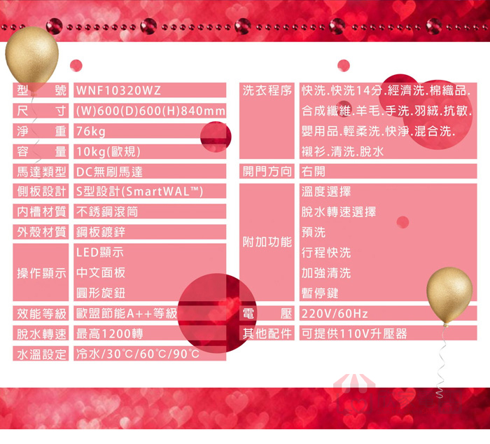 洗衣程序:快洗、快洗14分、經濟洗、棉織品、合成纖維、羊毛、手洗、羽絨、抗敏、嬰用品、輕柔洗、快淨、混合洗、襯衫、清洗、脫水