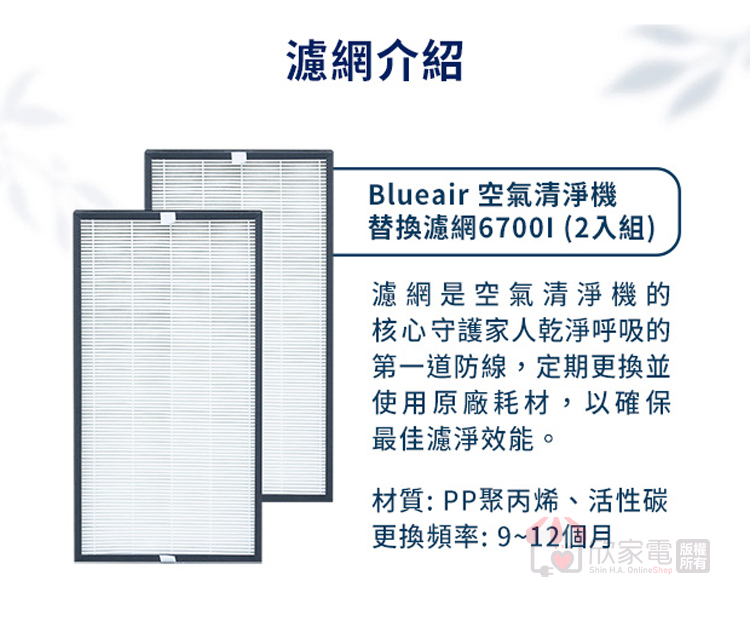 耗材:Blueair 空氣清淨機替換濾網 6700i (一組二入)