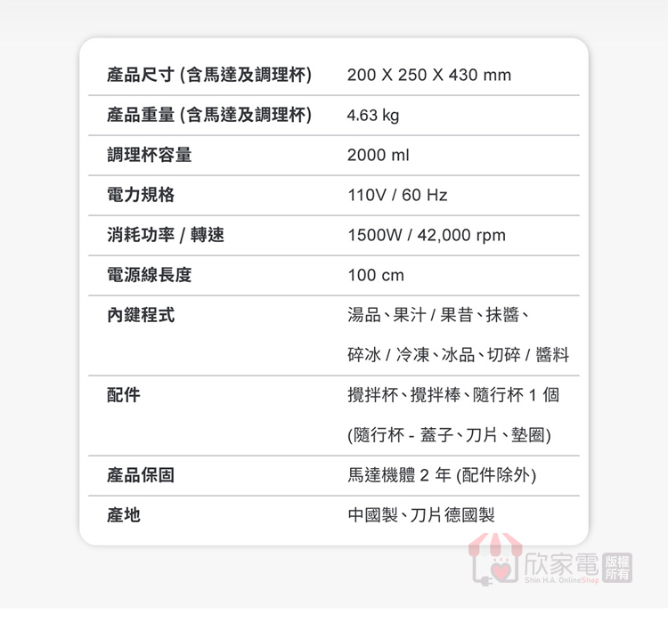 產品尺寸:200 x 250 x 430 mm (含馬達及調理杯)