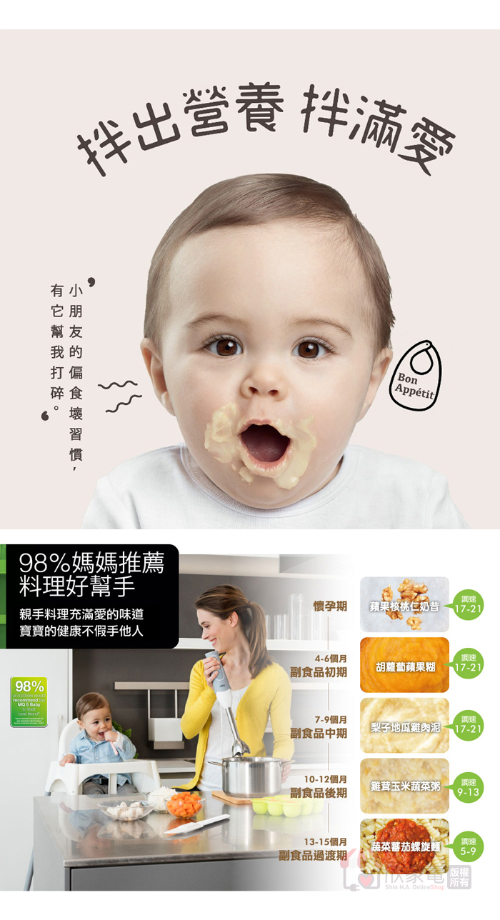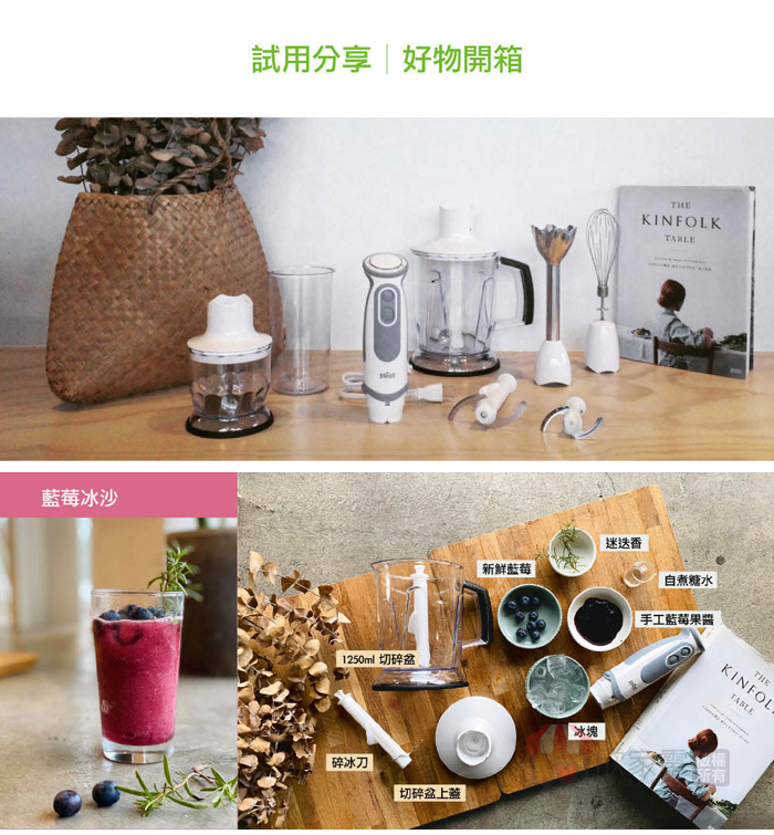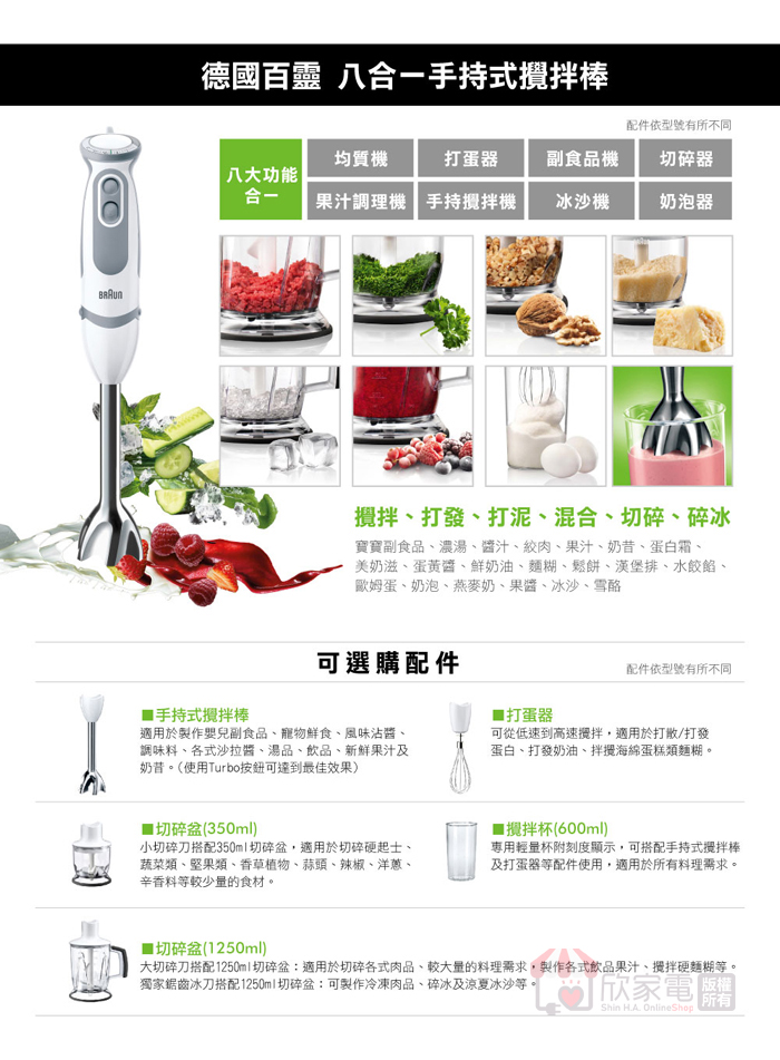5大配件:金鐘罩攪拌軸、小切碎刀、打蛋器、500ml 切碎盆、600 ml 攪拌杯