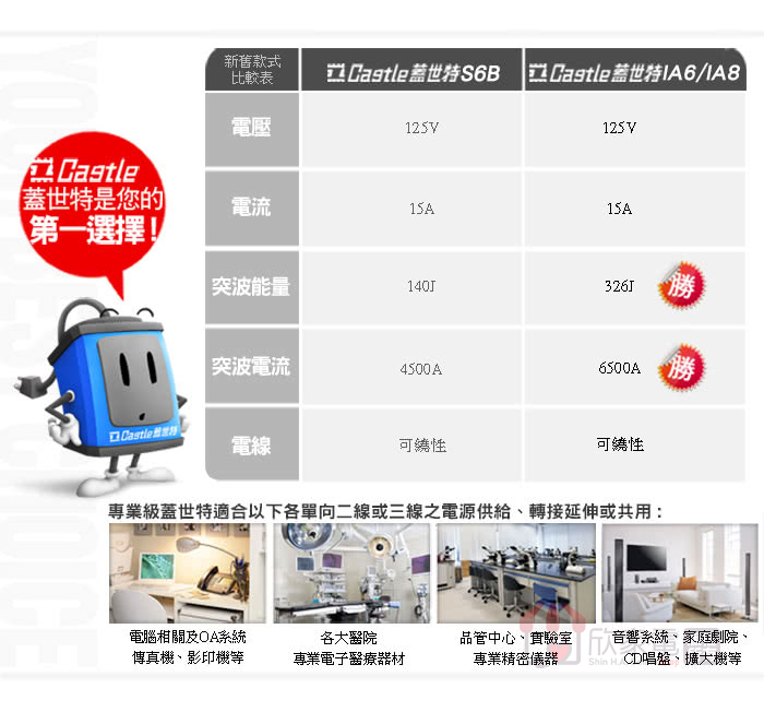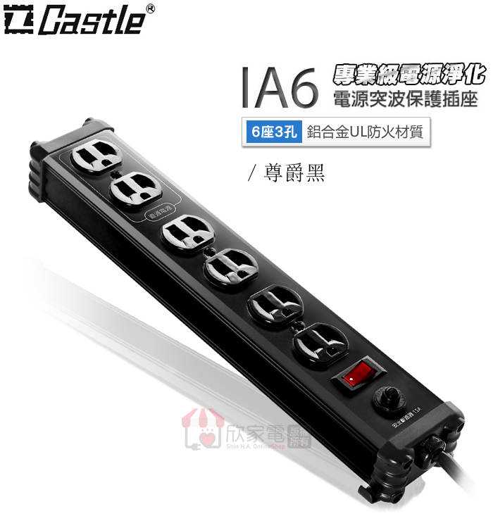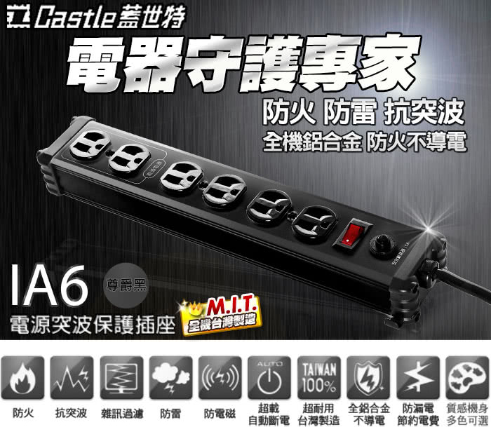 Castle 蓋世特 6座3孔 1.8米鋁合金電源突波保護插座-尊爵黑