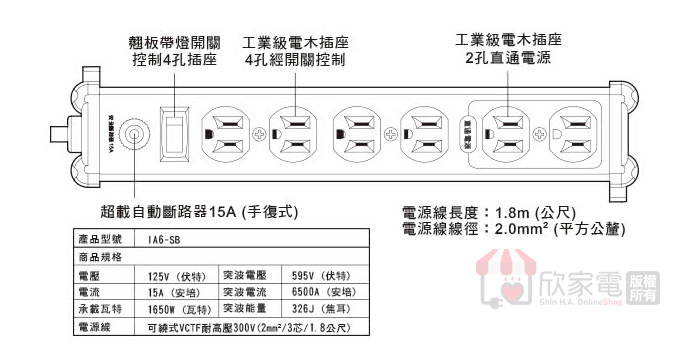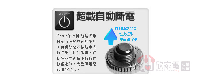 ※請勿超載使用,若超負荷用電時,自動斷電之按鈕將會自動彈出而斷電流,待排除超載現象後切,可將按鈕壓下,即可恢復正常供電。