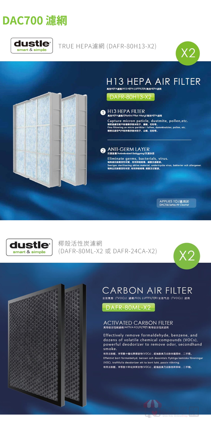 [選購] Dustie 強效甲醛過濾器 ×2 ( DAFR-70HF-X2,建議更換期限:連續使用3-6個月 ) ( 可取代 -椰殼活性炭濾網及TRUE HEPA濾網使用 )