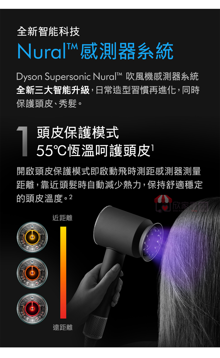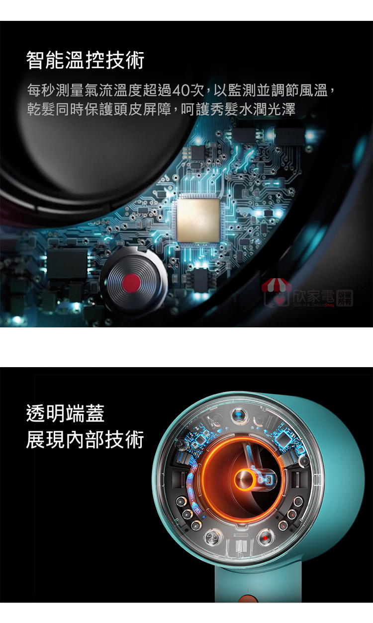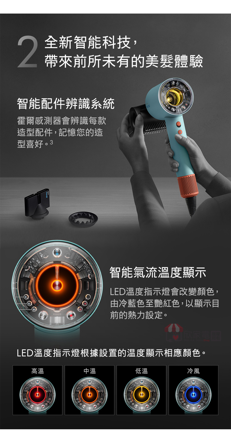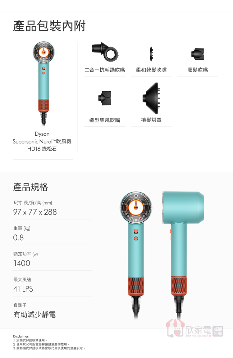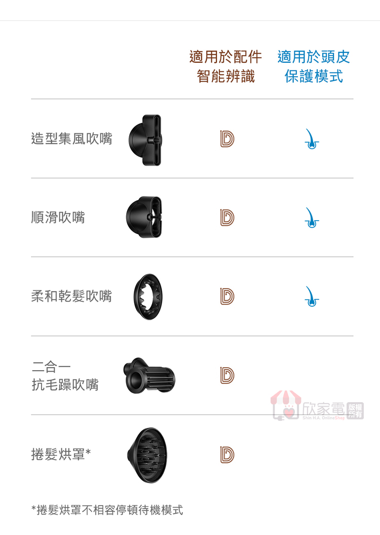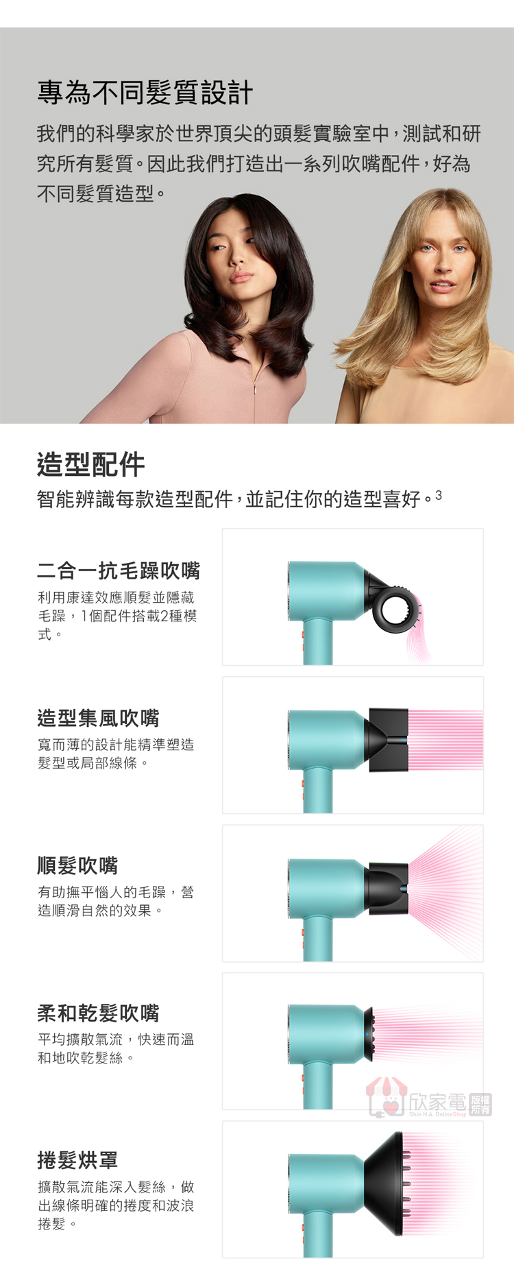 配件:二合一抗毛躁順髮吹嘴、 柔和乾髮吹嘴、 順髮吹嘴、 造型集風吹嘴、捲髮烘罩
