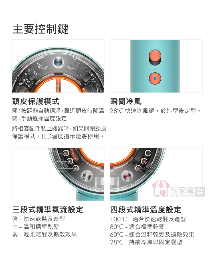 溫度設置:四段式精準溫度設定:100°C—快速乾髮和造型,80°C—適合標準乾髮,60°C—適合溫和乾髮及擴散效果,28°C—持續冷風,為您的造型定型