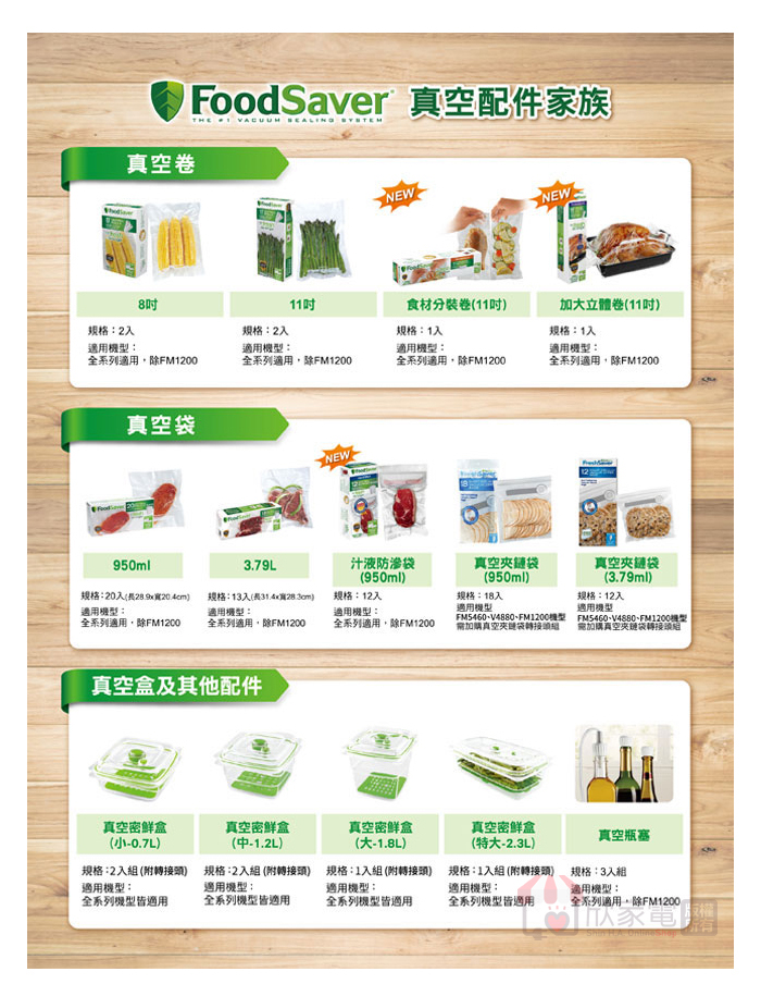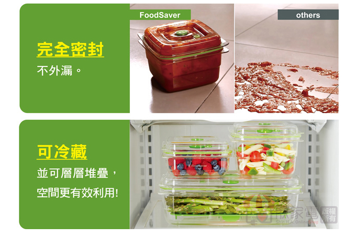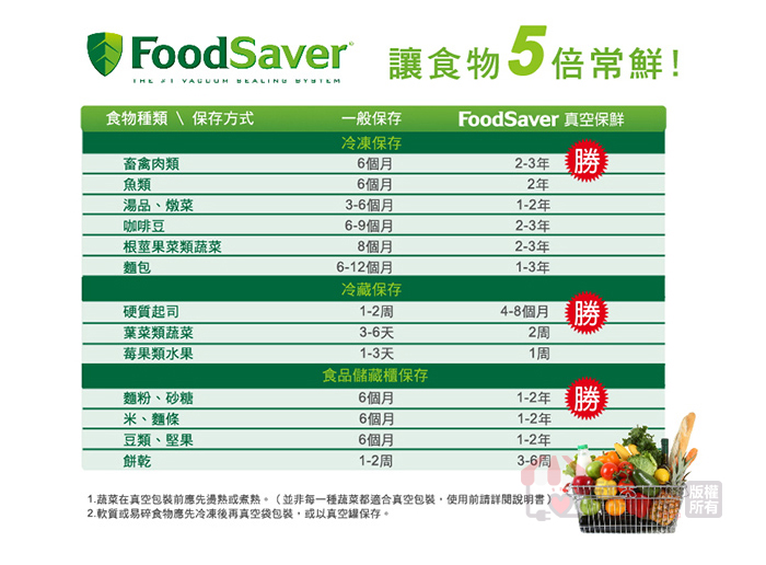 *請注意,FoodSaver真空保鮮無法取代冷藏或冷凍,任何易變質或腐壞,需要冷藏的食物,在真空包裝後仍需冷藏或冷凍。