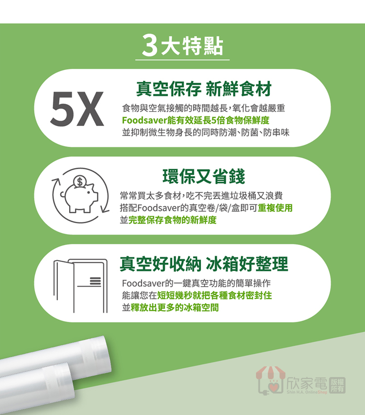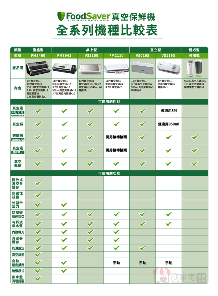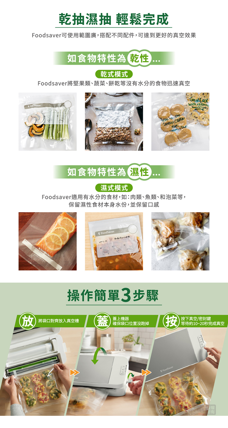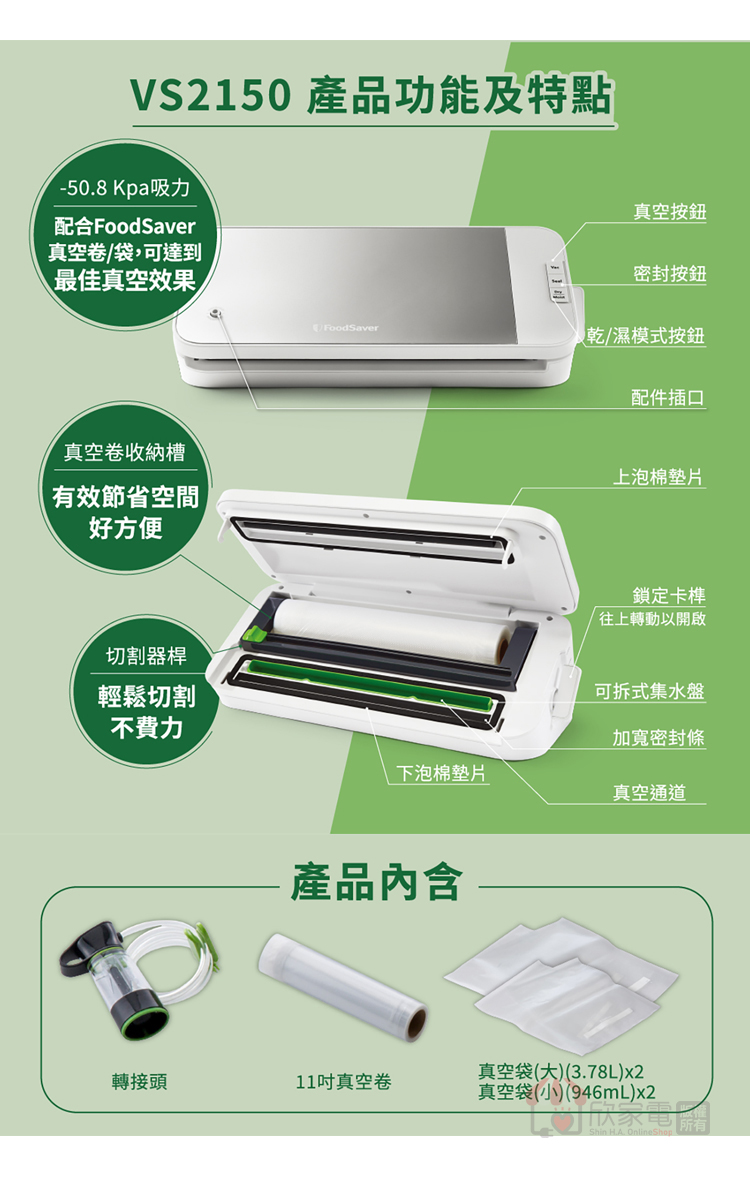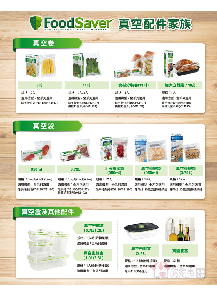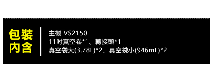 配件:保證書、中文說明書 附屬品:11吋真空卷*1、真空袋大(3.78L)*2、真空袋小(946mL)*2、轉接頭*1