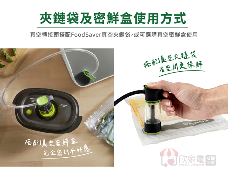 搭配轉接頭使用:真空罐、真空密鮮盒、真空夾鏈袋、真空瓶塞