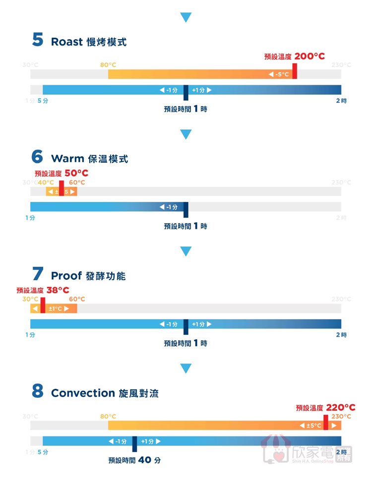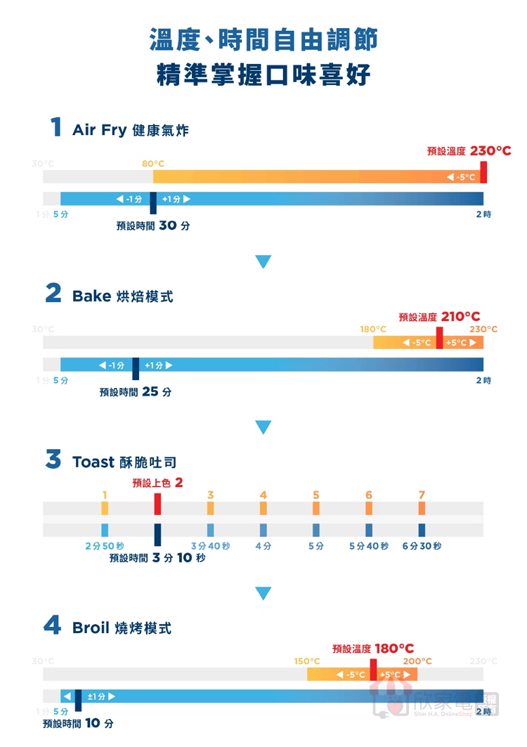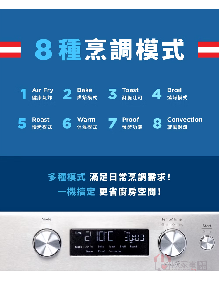 設定/功能:氣炸、烘烤、對流、烤肉、上火、保溫、發酵