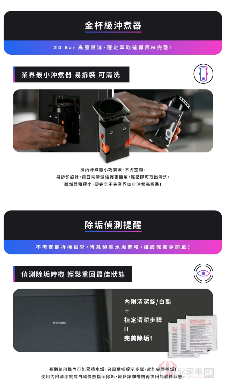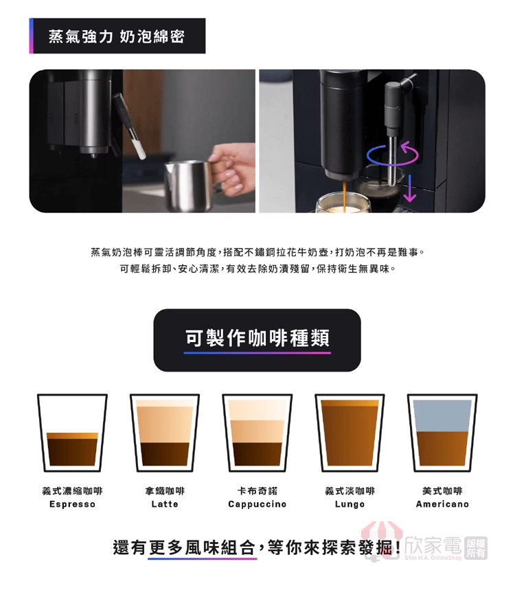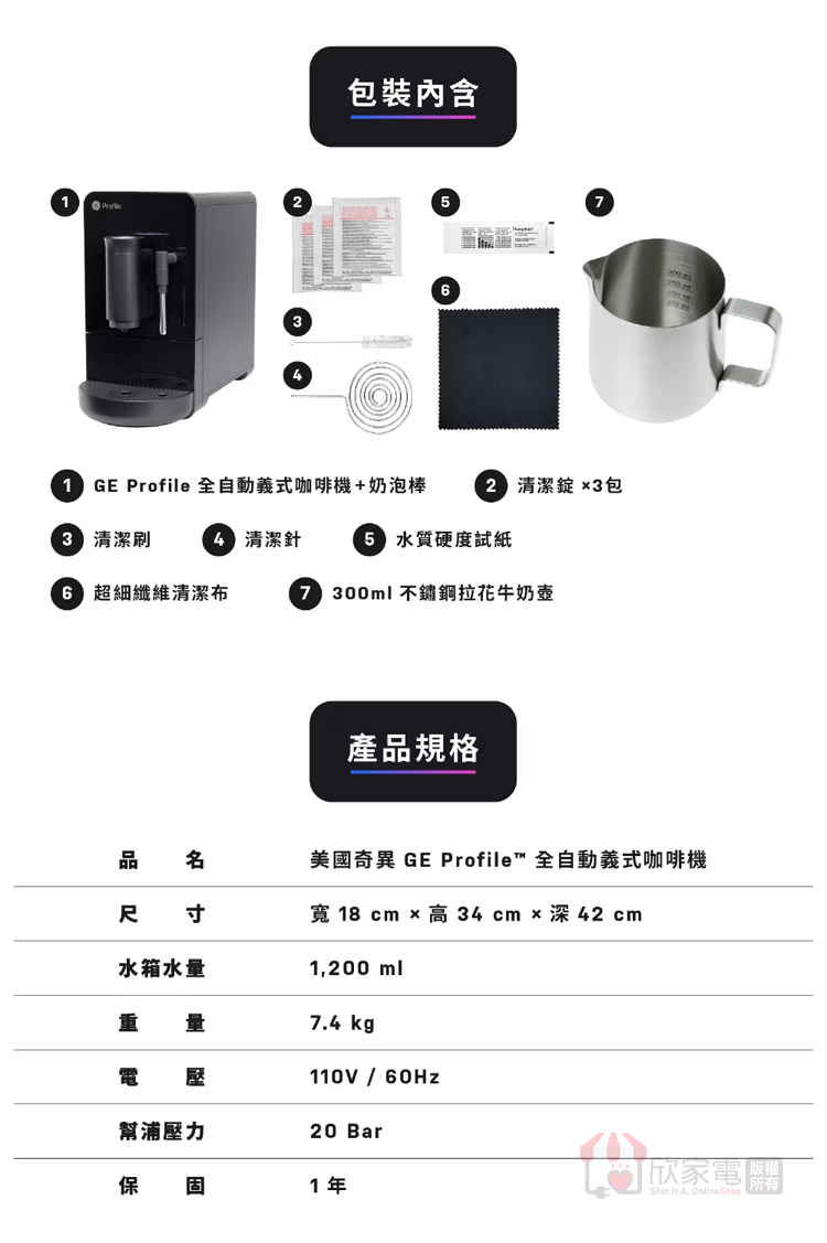 包裝內含:主機、清潔錠x3、清潔刷、清潔針、水質硬度試紙、超細纖維清潔布、300ml不鏽鋼拉花牛奶壺