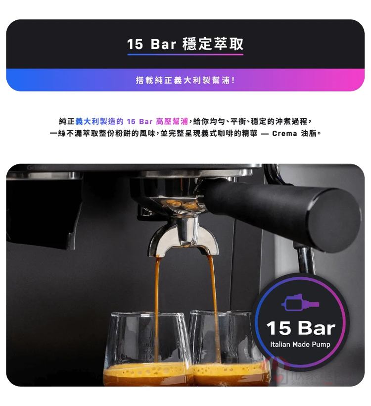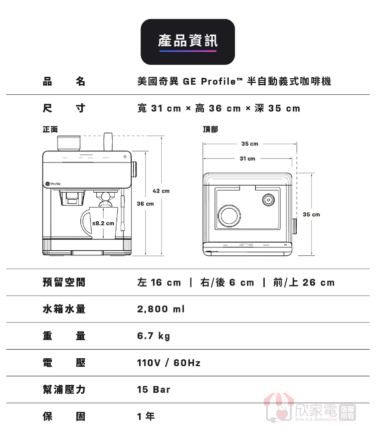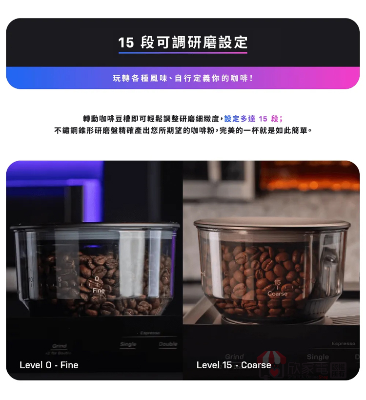 咖啡出量:預設容量:1杯:15-50毫升,2杯:45-90毫升