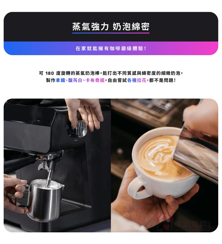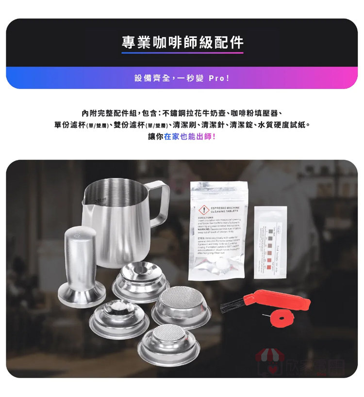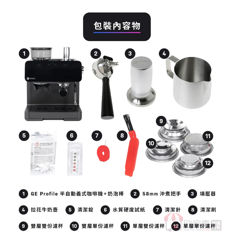 包裝內含:主機、58m沖煮把手、填壓器、拉花牛奶壺、清潔錠、水質硬度試紙、清潔針、清潔刷、雙層雙份濾杯、雙層單份濾杯、單層雙份濾杯、單層單份濾杯
