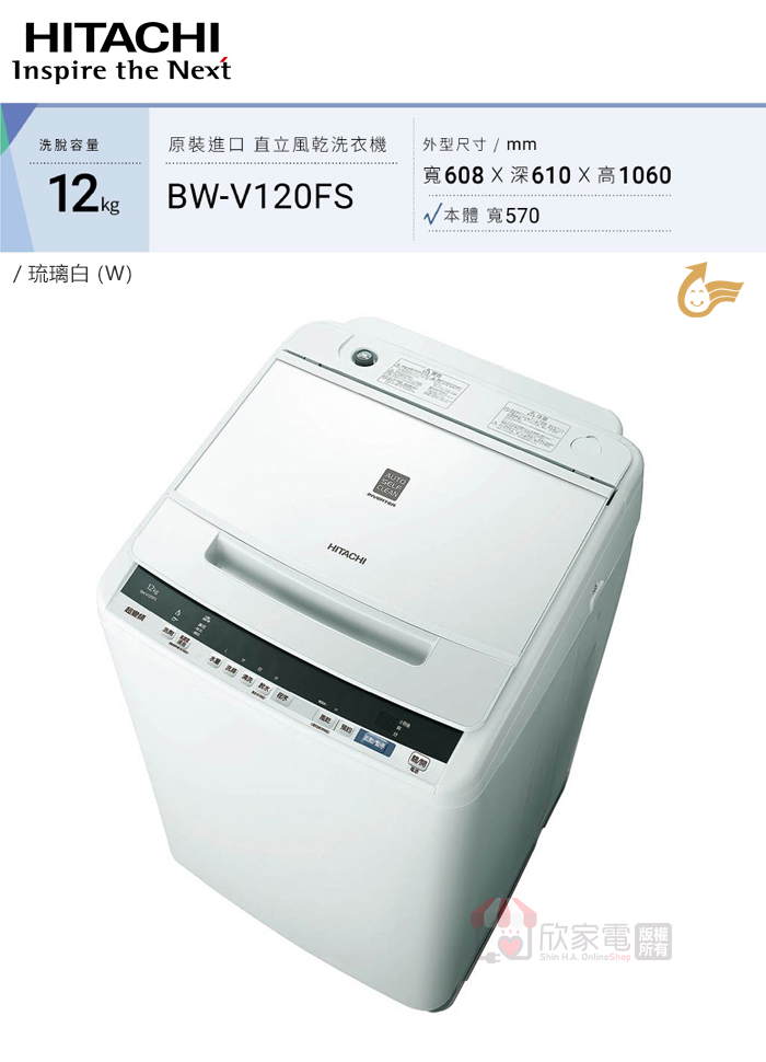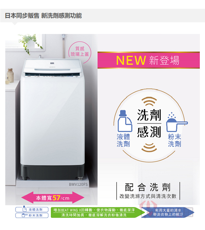 HITACHI 日立 12KG 變頻直立式洗衣機-琉璃白