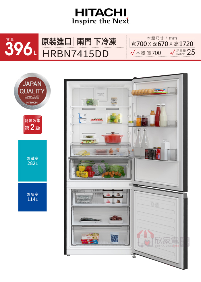 HITACHI 日立 396公升 變頻上冷藏下冷凍雙門冰箱