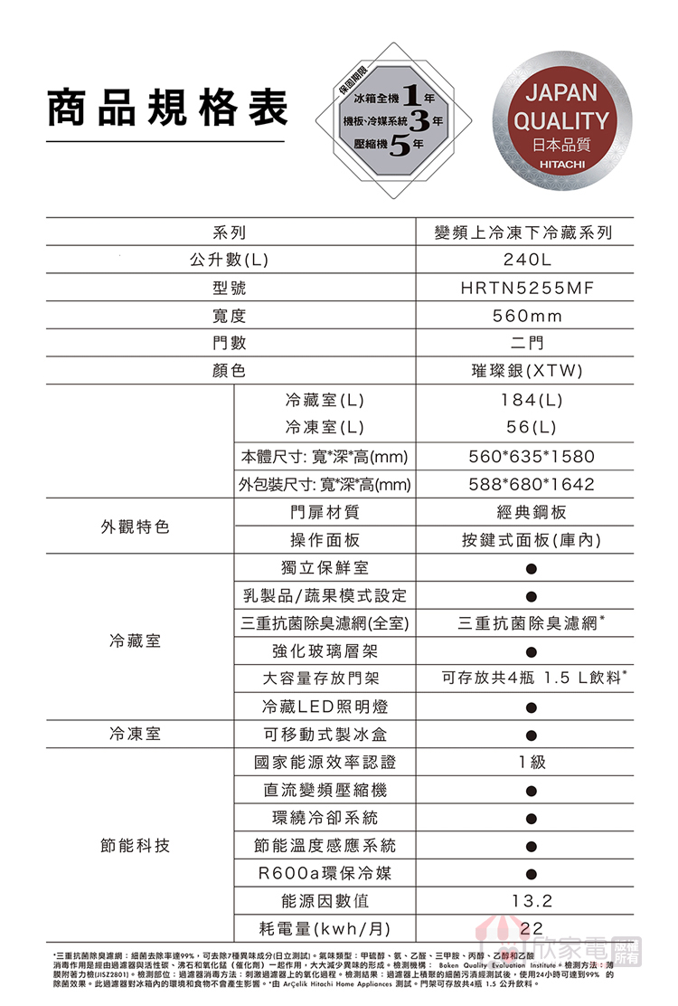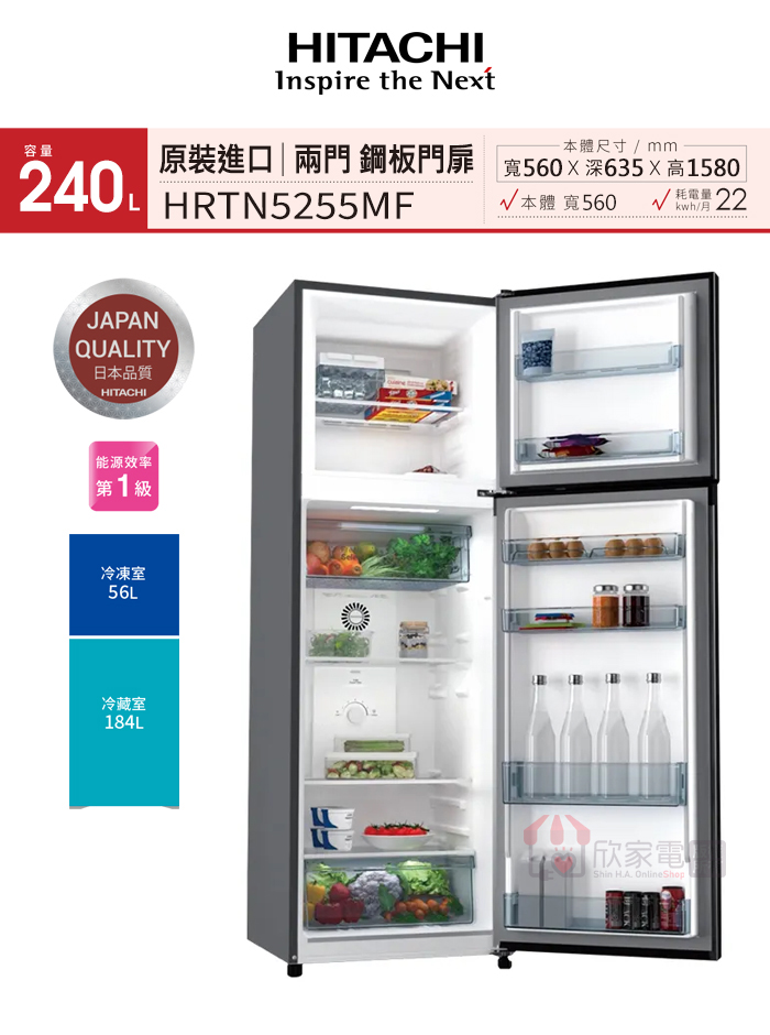 公升數(L):240 (冷凍56L/冷藏184L)