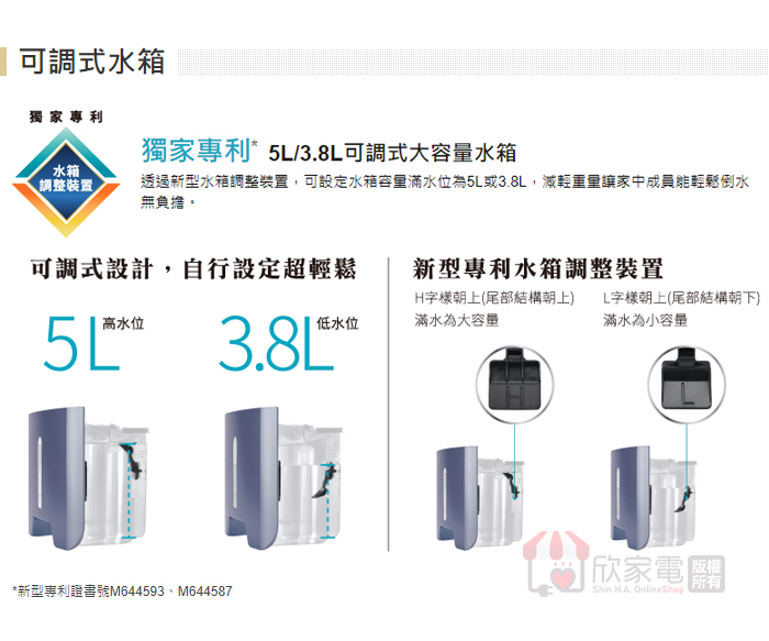 水箱容量:高/低水位二段可調(高:約5公升;低:約3.8公升)