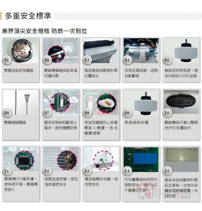 迴轉式壓縮機、停電自動復歸/自動除霜、多項防護裝置