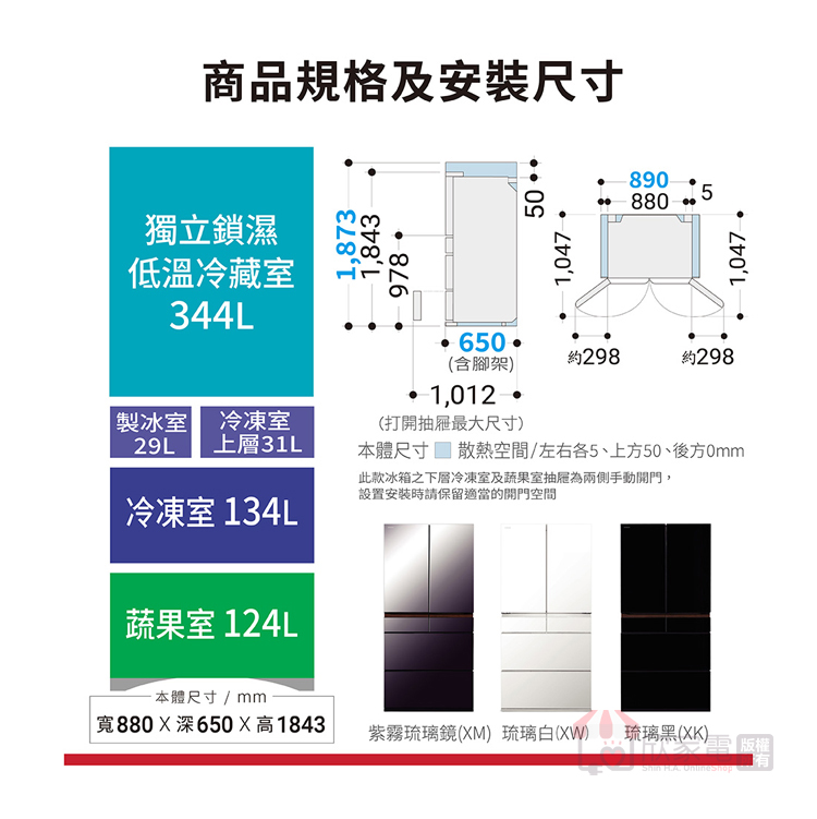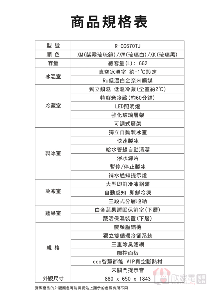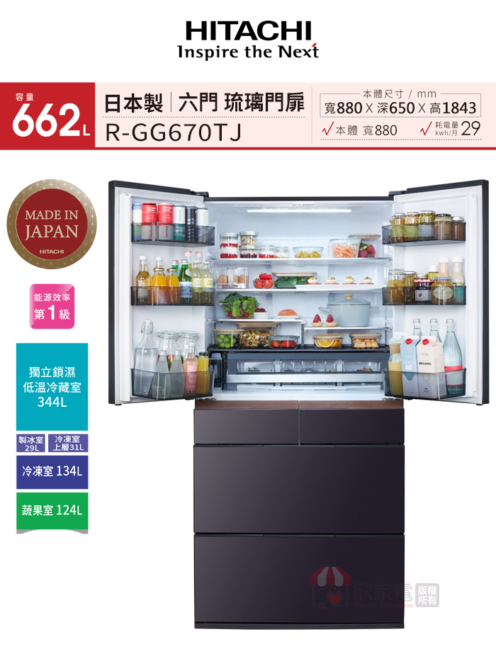 公升數(L):662 (冷藏344L/製冰29L/上層冷凍31L/下層冷凍134L/蔬果124L )