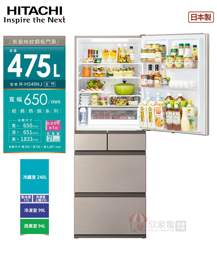 HITACHI 日立 475公升 日本原裝 變頻五門冰箱