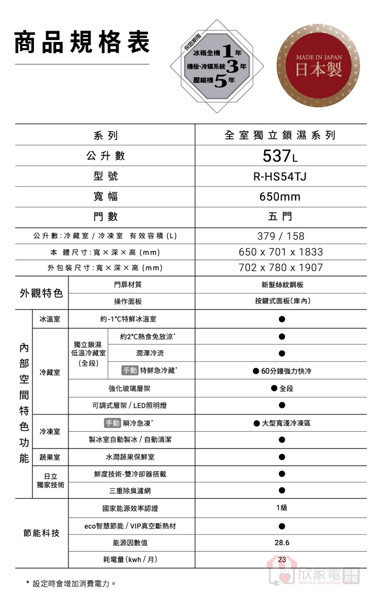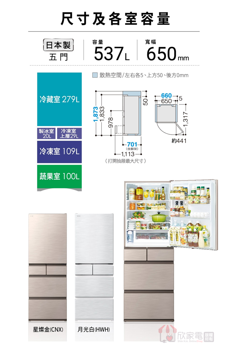 公升數(L):537 (冷藏279L/製冰20L/上層冷凍29L/下層冷凍109L/蔬果100L )