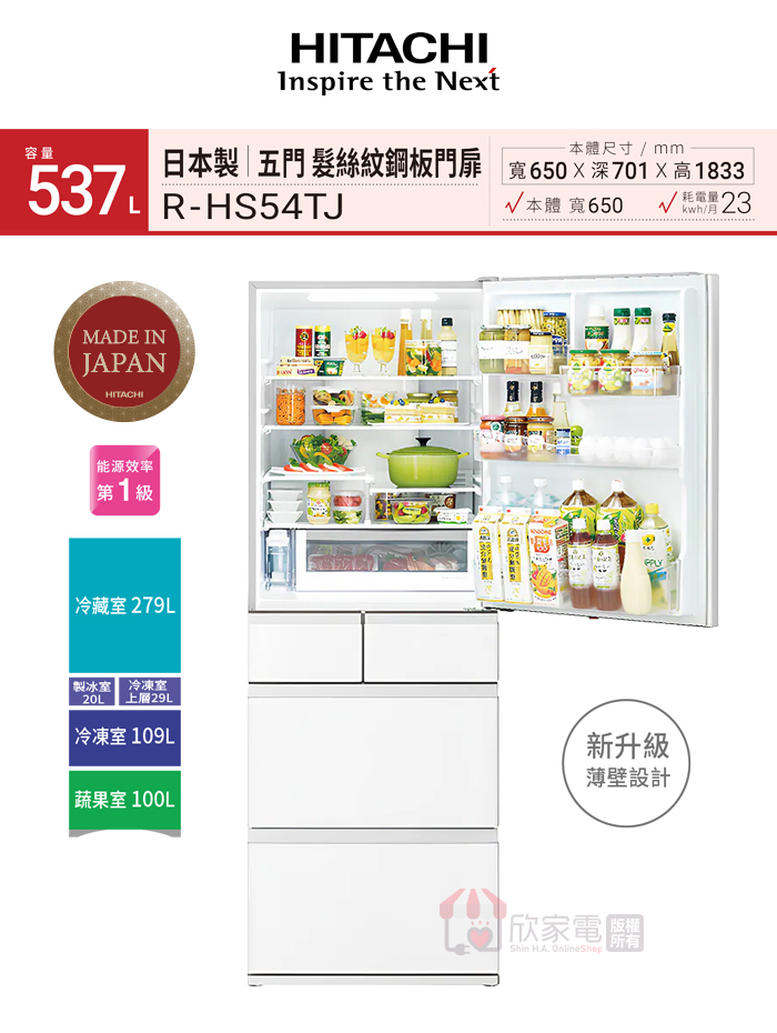 HITACHI 日立 537公升 日本原裝 變頻五門冰箱