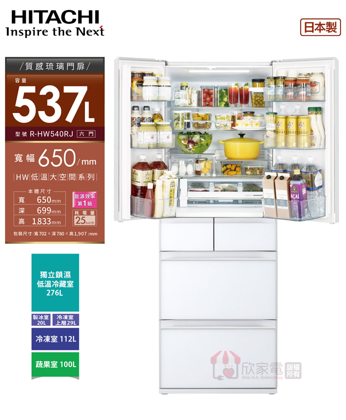 公升數(L):537 (冷藏276L/製冰20L/上層冷凍29L/下層冷凍112L/蔬果100L )