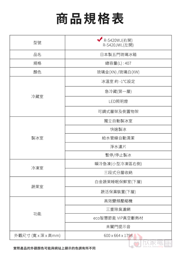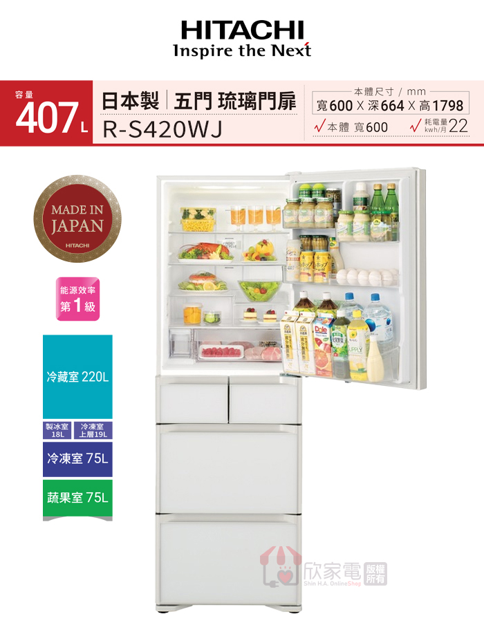公升數(L):407 (冷藏220L/製冰18L/上層冷凍19L/下層冷凍75L/蔬果75L )