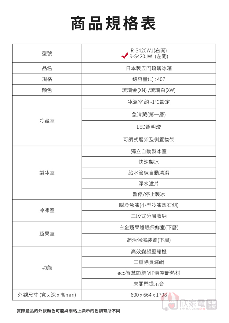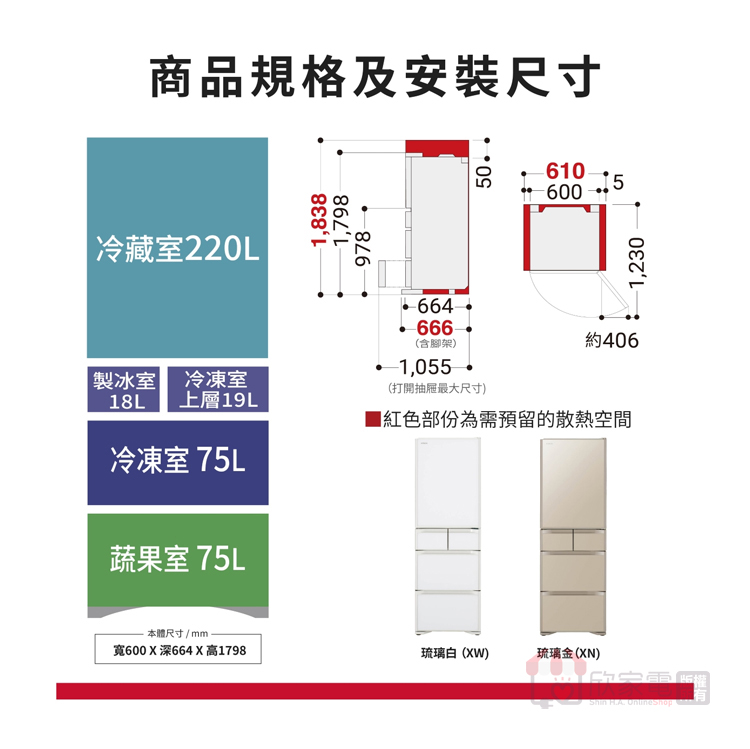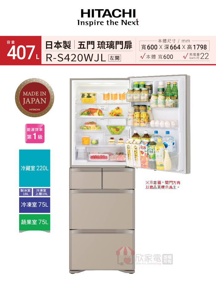 公升數(L):407 (冷藏220L/製冰18L/上層冷凍19L/下層冷凍75L/蔬果75L )
