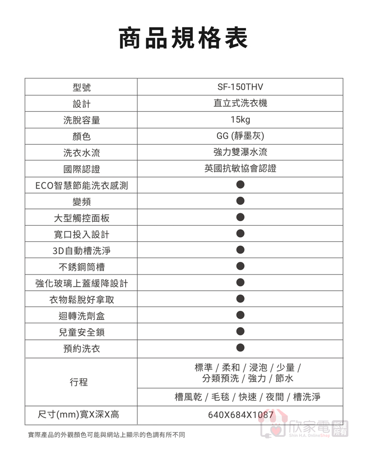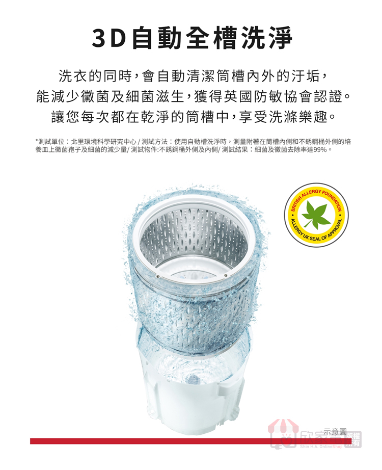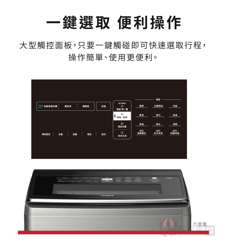 毛毯/大物行程、拋鬆衣物脫水、強化玻璃上蓋、門扉上開緩降設計、觸控式面板操作