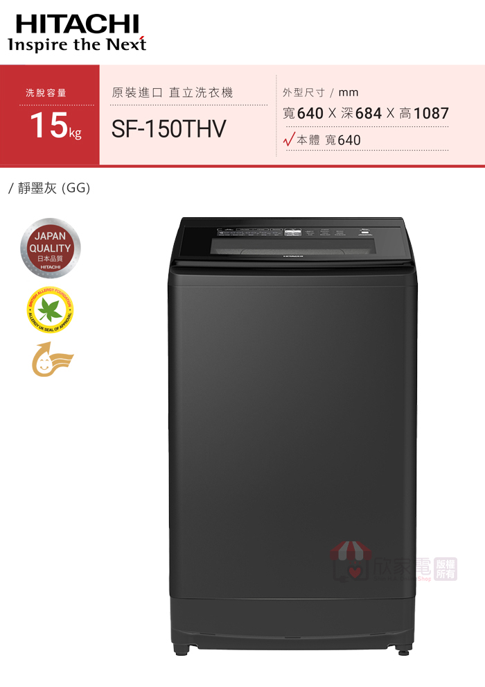 HITACHI 日立 15KG 變頻直立式洗衣機-靜墨灰
