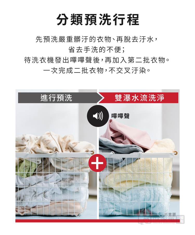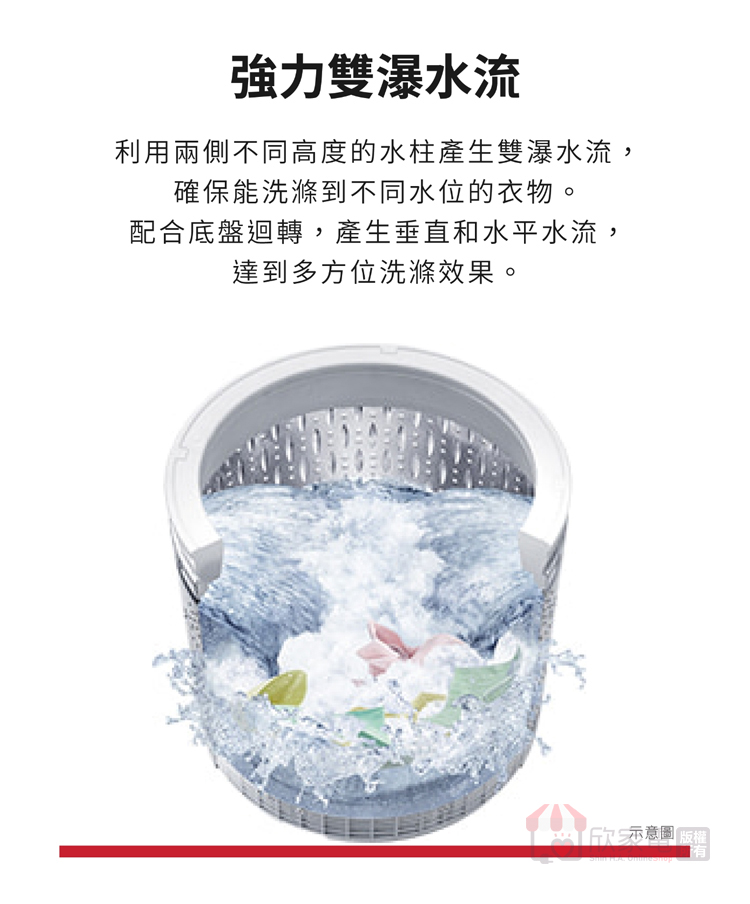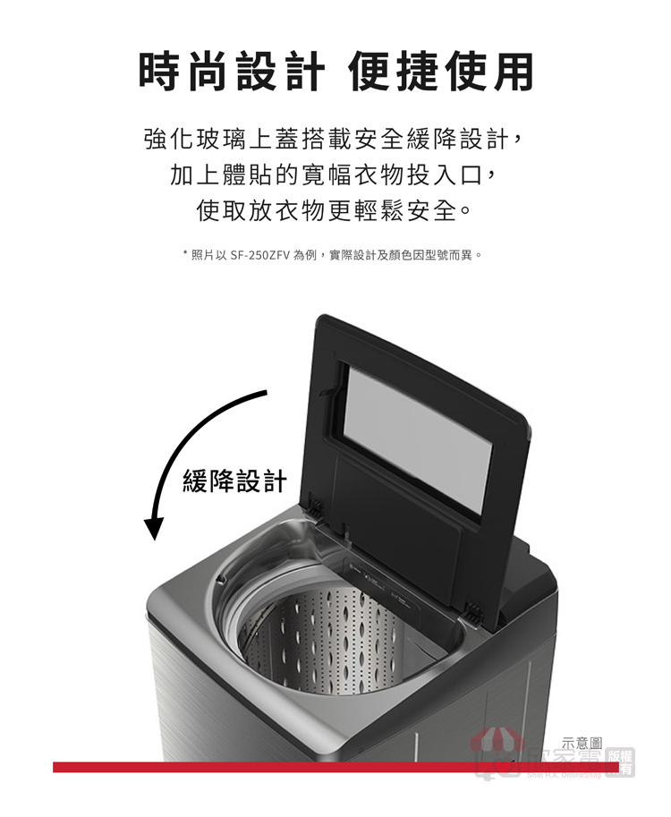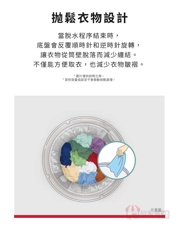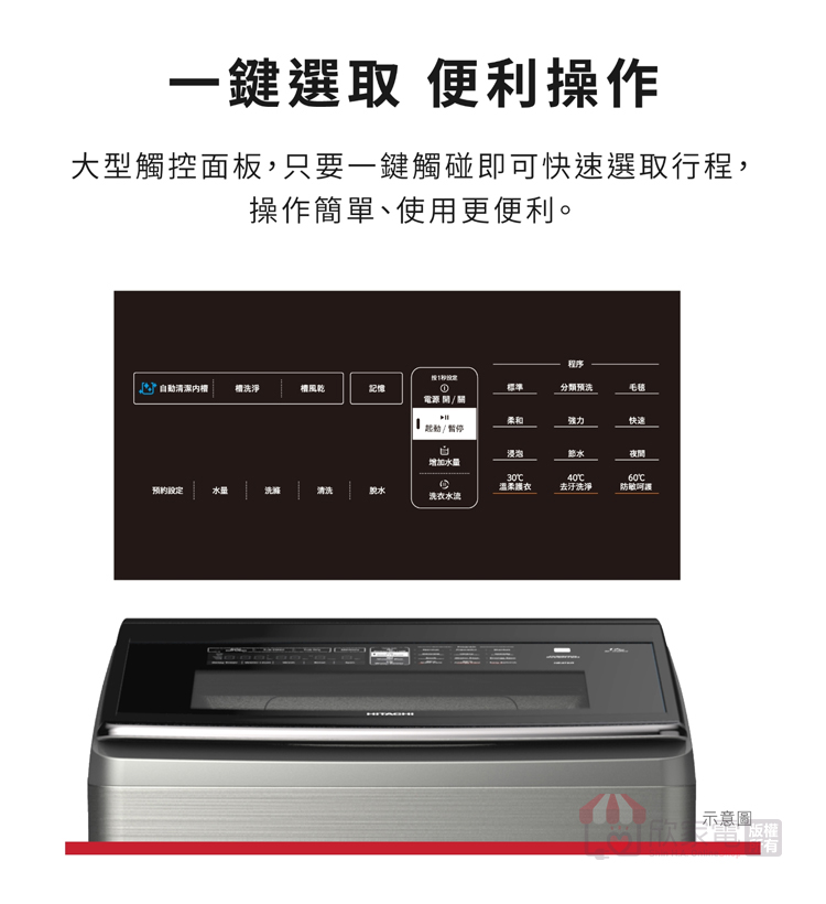 毛毯/大物行程、拋鬆衣物脫水、強化玻璃上蓋、門扉上開緩降設計、觸控式面板操作