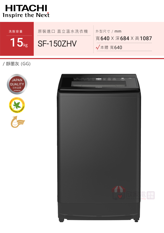 HITACHI 日立 15KG 變頻溫水直立式洗衣機-靜墨灰