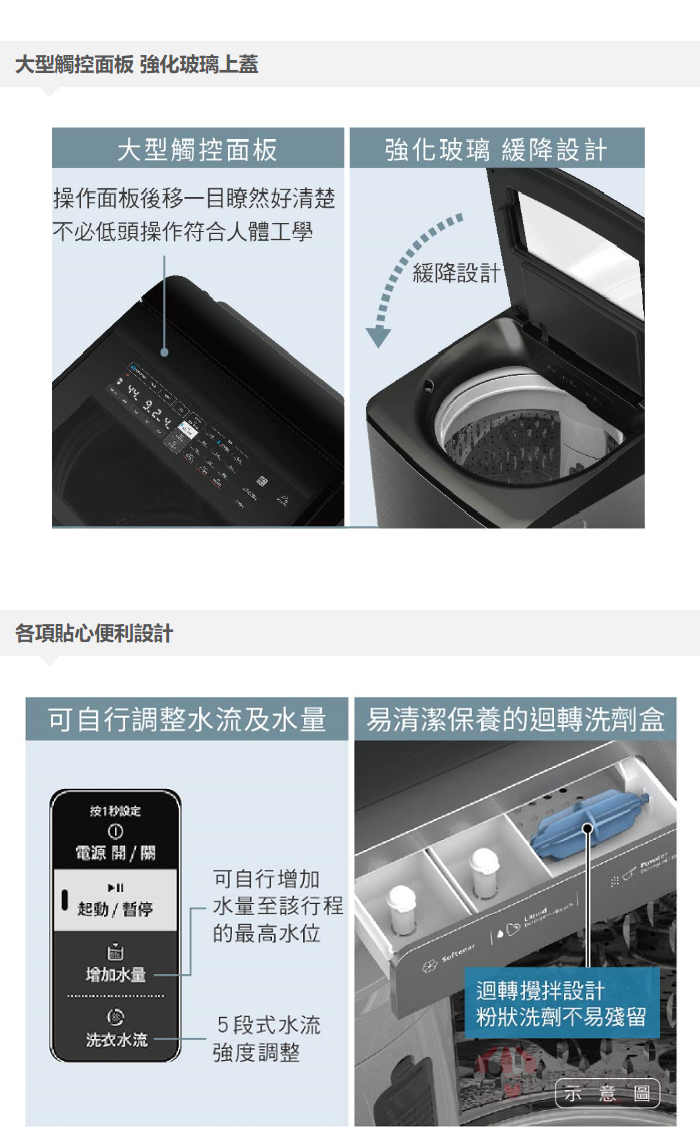 預洗功能、拋鬆脫水、預約/兒童安全鎖、上開緩降門扉、觸控玻璃門板