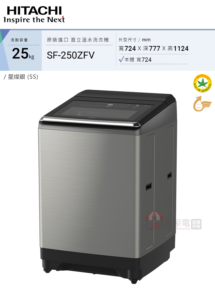 HITACHI 日立 25KG 溫水變頻直立式洗衣機-星燦銀