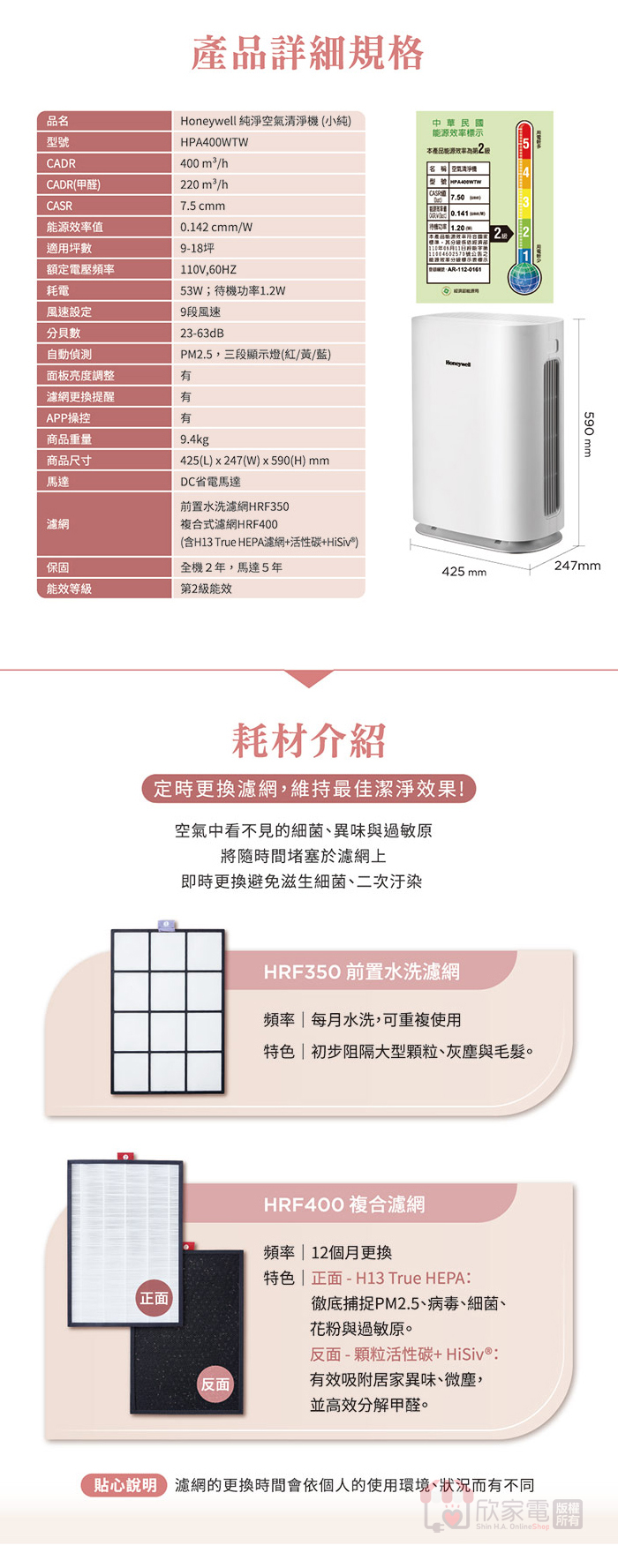複合式濾網:HRF400 (含H13 True HEPA濾網+活性碳+HiSiv;建議每12個月更換一次)