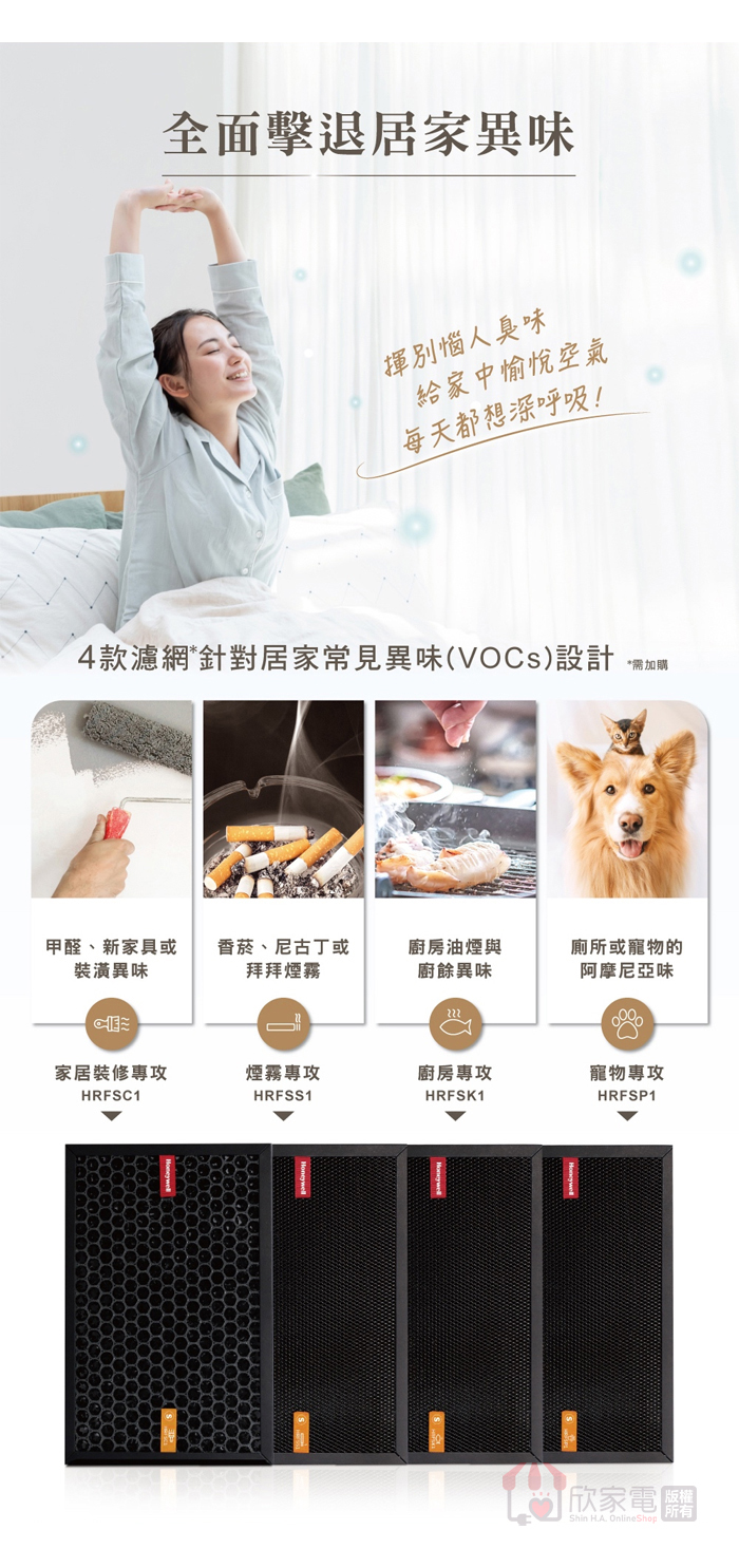 HRF-SS1(煙霧)、HRF-SC1(家居裝修)、HRF-SK1(廚房)、HRF-SP1(寵物) ※一盒1片,此機種每次更換需2片