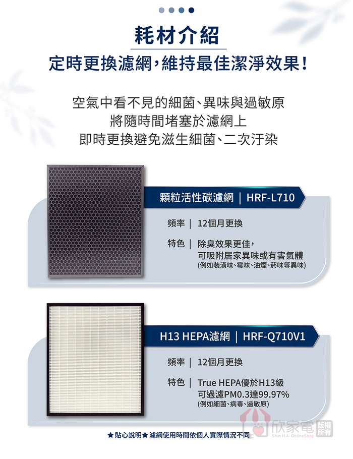 True HEPA濾網:HRF-Q710V1 (1入,建議每12個月更換一次)