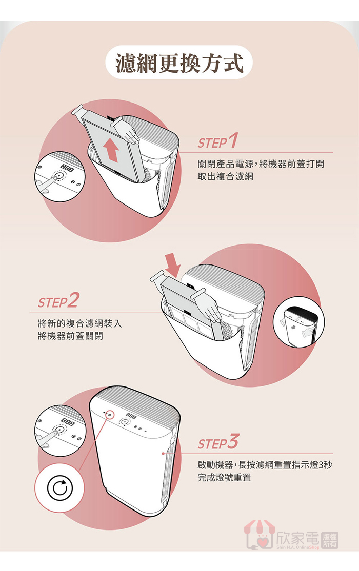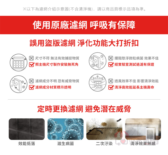 ※請使用原廠濾網,以確保最佳空氣清淨品質及機器壽命與安全,有保障又安心。