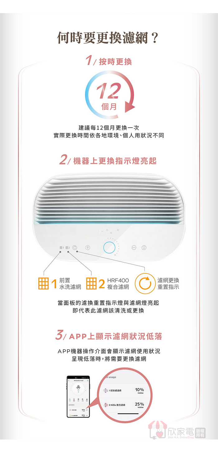 建議更換頻率:每12個月更換一次,依照個人使用頻率、環境不同而定