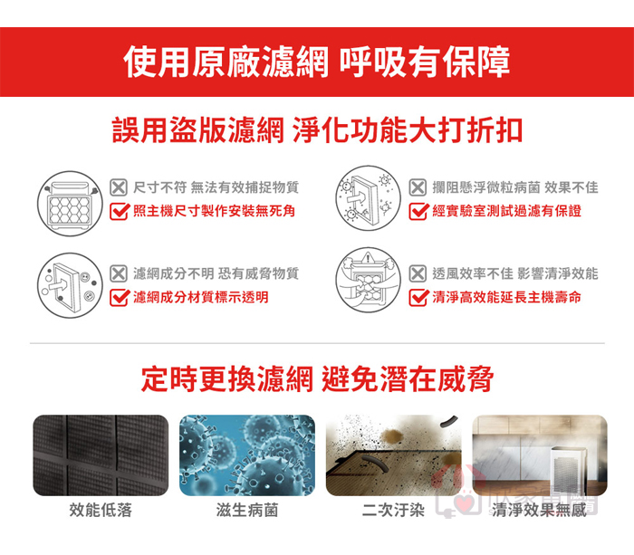 ※請使用原廠濾網,以確保最佳空氣清淨品質及機器壽命與安全,有保障又安心。
