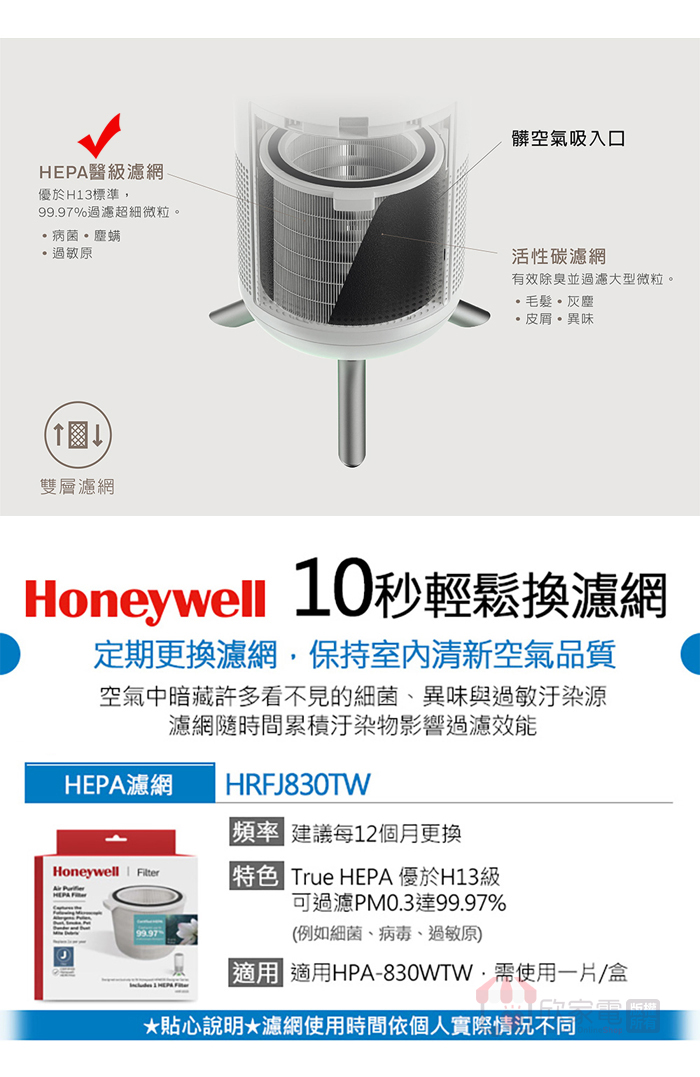 ※貼心提醒:此耗材適用於「HPA830WTW 空氣清淨機」購買前請先確認您的機型!