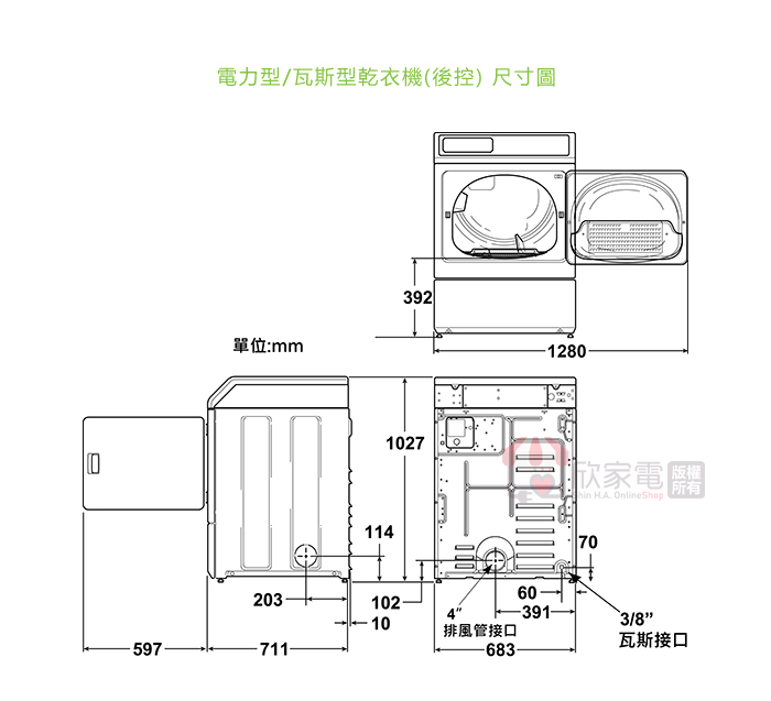 外觀尺寸(mm):寬683 x 深711 x 高1027
