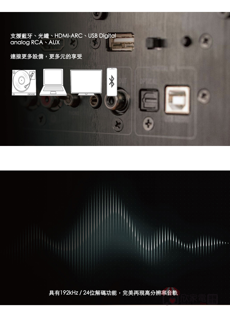 輸入:HDMI-ARC with CEC、藍牙、光纖、AUX、USB Digital、Phono/Line