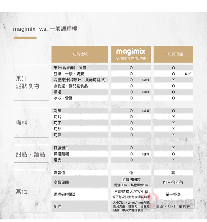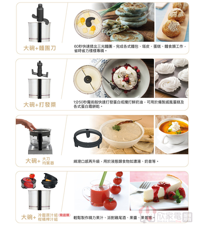 大刀片/小刀片(切碎、攪拌、混合、乳化)、麵團刀(製作麵糰)、打發槳(打發蛋白、攪打鮮奶油)、2mm/4mm刨絲刨片刀盤(切片、切絲)、均質器(製作濃湯)、抹刀、配件收納盒、食譜、柑橘榨汁器*只有5200XL內附(可輕鬆製作柑橘類果汁)