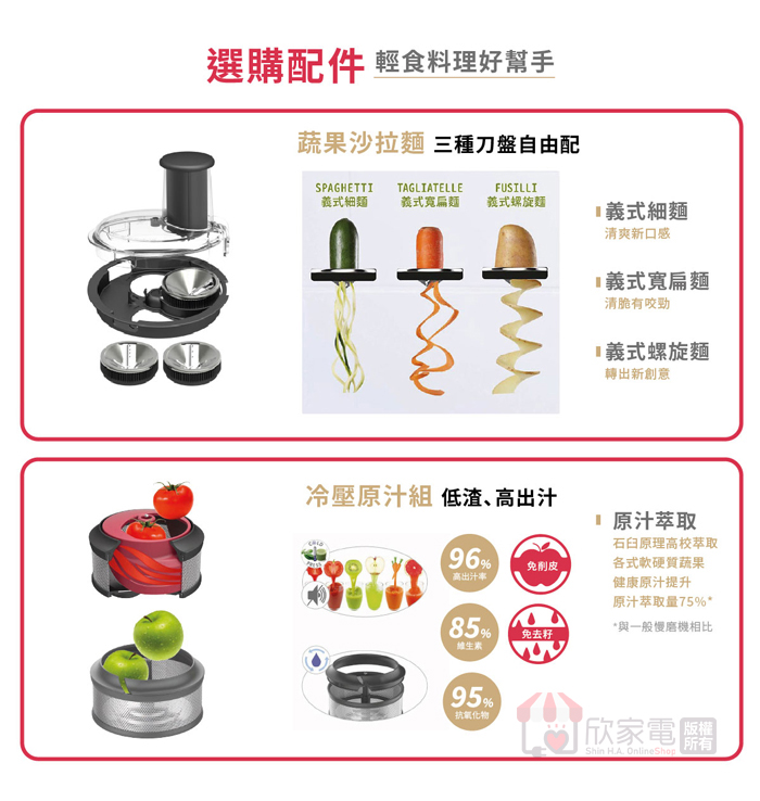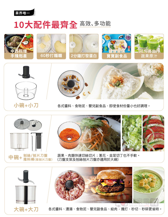 大/中/小碗、碗蓋、大刀片、麵團刀、打發槳、2mm/4mm刨絲刨片刀盤、抹刀、配件收納盒、均質器、食譜、保證書