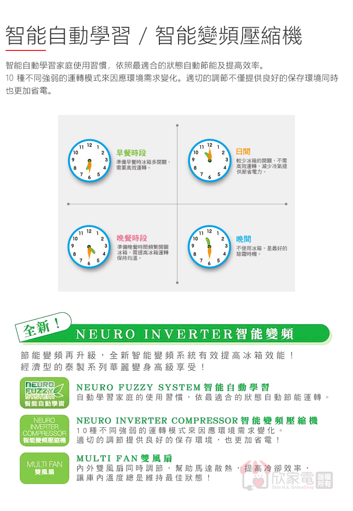 玻璃鏡面、立體冷流、無須除霜、無氟氯碳化合物、清新潔淨濾網、智能變頻、開門警鈴