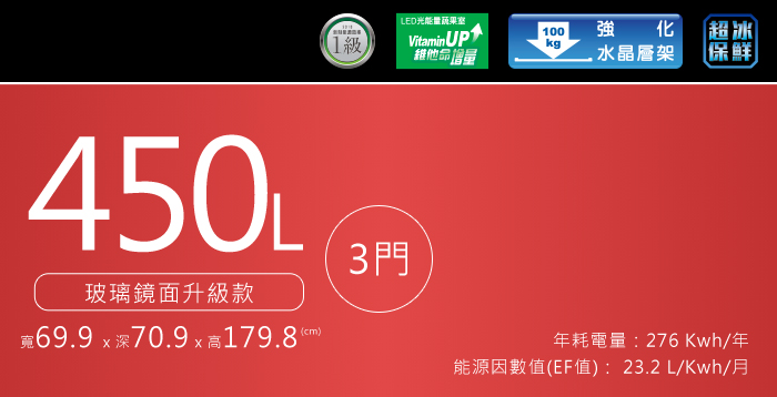 容量:450L (冷藏 253L/蔬果 90L/冷凍 107L)